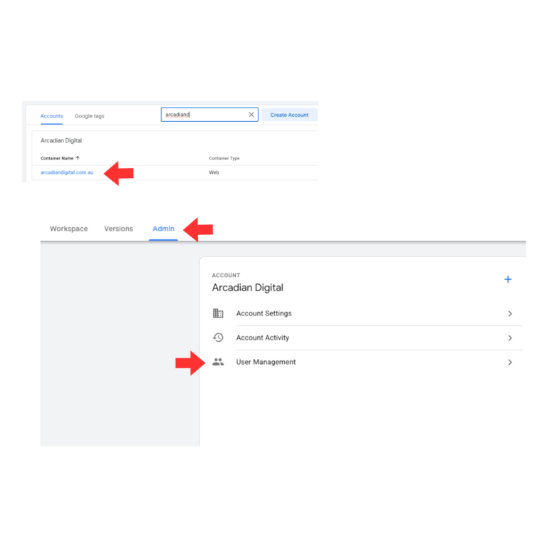 We will be looking to add ‘clients@arcadiandigital.com.au’ to your existing Google Tag Manager container.